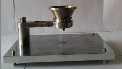 2、電鍍鋼底板:底板由鋼制成或大理石、不銹鋼等耐腐蝕的材料制成,最小尺寸為:寬200mm、長(zhǎng)270mm、厚18mm。在拋光電鍍的底板上表面上刻有四條互成45。角的直線。正好在漏斗處的中心部分有1個(gè)固定高度量規(guī)的定位銷,底板下面有3個(gè)可調(diào)水平的支腳。